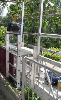 Heb je echter lichte onderhoudswerkzaamheden, zoals schilderen, kitten en ander kleinere herstelwerkzaamheden, dan is een hangbrug in combinatie met een overstapvoorziening een goed alternatief. De overstapvoorziening heeft een veilige op- en afstap naar het balkon en een automatische veiligheidsafslag, zodat de hangbrug niet zomaar kan bewegen wanneer deze aan het balkonhek is gekoppeld. De overstapvoorziening wordt op een zijpaneel van de hangbrug gemonteerd en heeft aan de balkonzijde een verstelbare ladder waardoor je altijd weer makkelijk de brug in klimt. Door de extra verhoogde leuning aan de buitenzijde van de brug kan je veilig overstappen zonder gebruik van persoonlijke valbeveiliging.