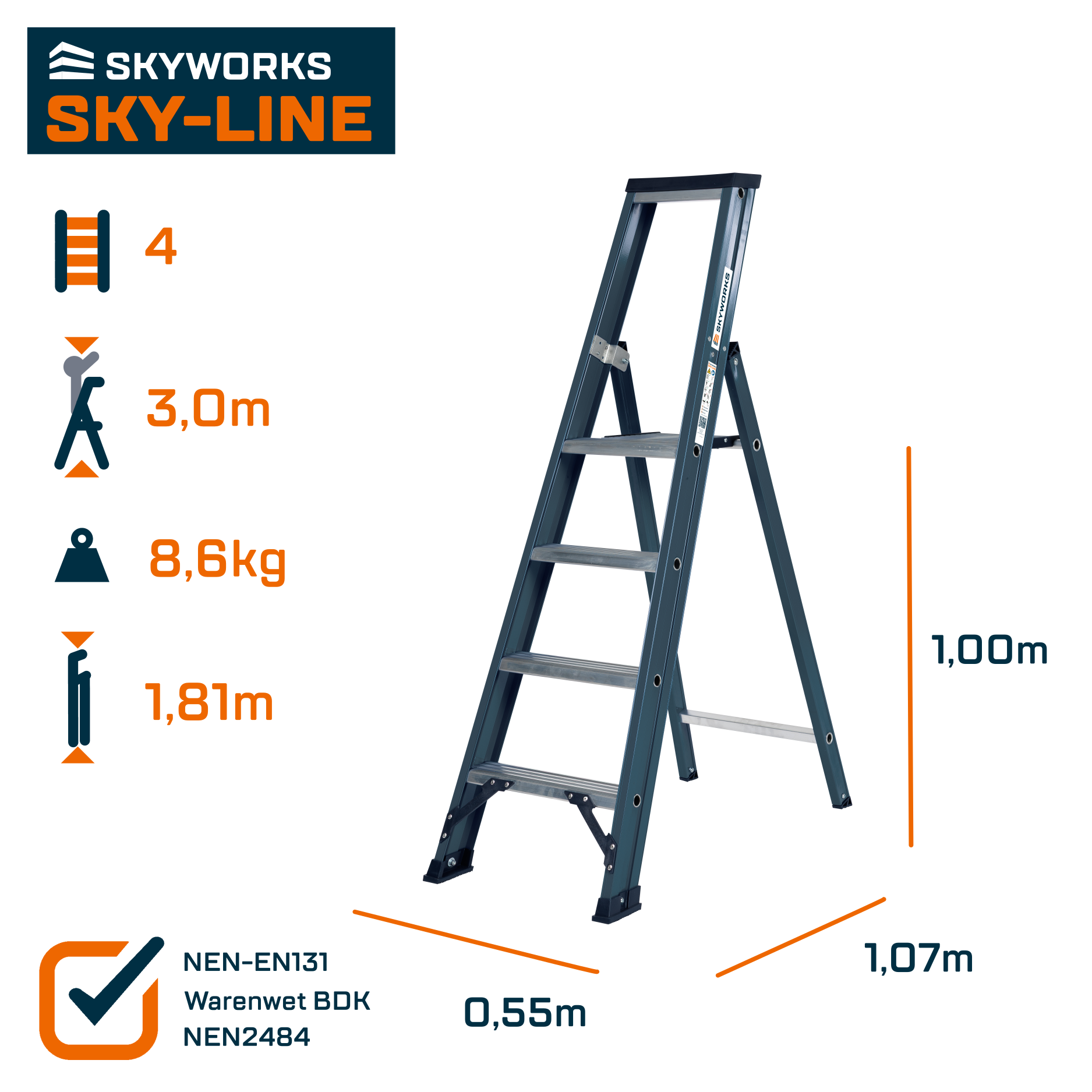 De Sky-Line bordestrap 4 treden is ideaal voor diverse onderhoudswerkzaamheden in en om een pand tot een werkhoogte van 3,0m. De trap is enkel oploopbaar en heeft 10cm diepe treden waardoor je comfortabel naar het stabordes klimt. De vaste kniebeugel, die standaard voorzien is van een materiaalbakje, geeft een goede steun wanneer je op het platform staat en biedt bij het klimmen extra houvast. Hierdoor kan je altijd veilig bij je werk komen.