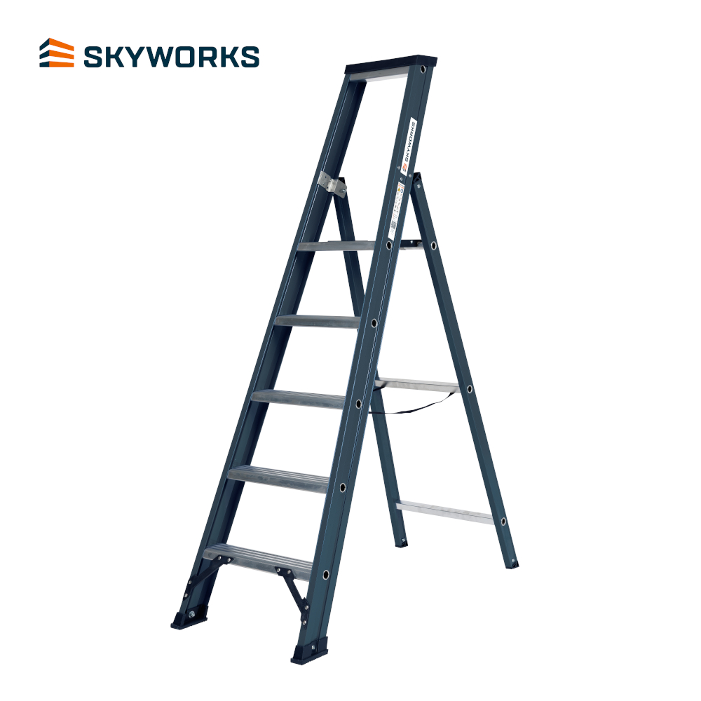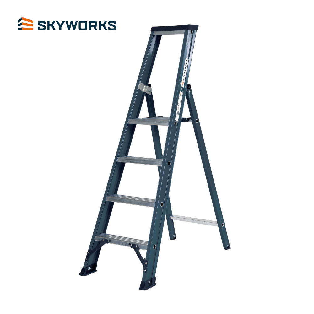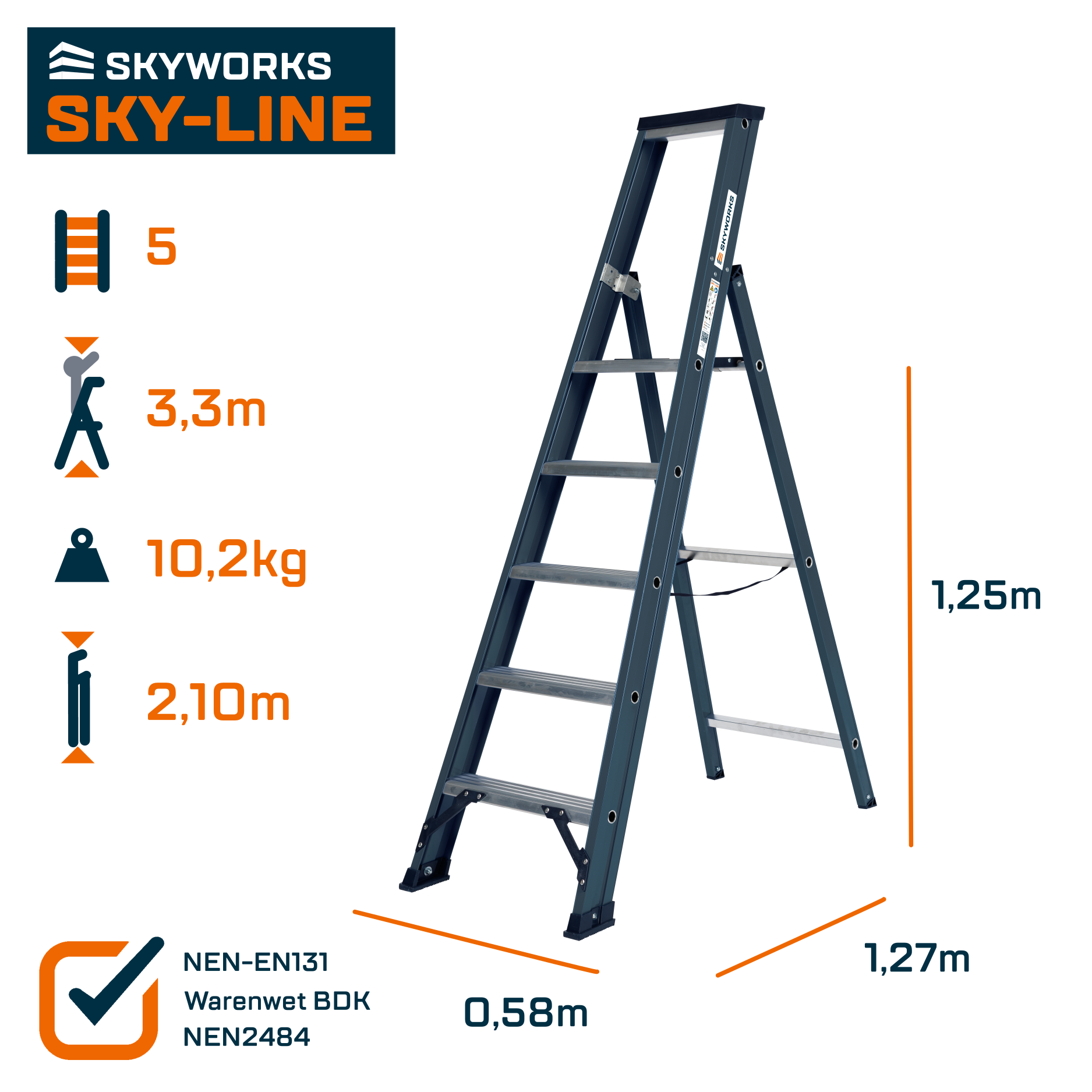 De Sky-Line bordestrap 5 treden is ideaal voor diverse onderhoudswerkzaamheden in en om een pand tot een werkhoogte van 3,3m. De trap is enkel oploopbaar en heeft 10cm diepe treden waardoor je comfortabel naar het stabordes klimt. De vaste kniebeugel, die standaard voorzien is van een materiaalbakje, geeft een goede steun wanneer je op het platform staat en biedt bij het klimmen extra houvast. Hierdoor kan je altijd veilig bij je werk komen.