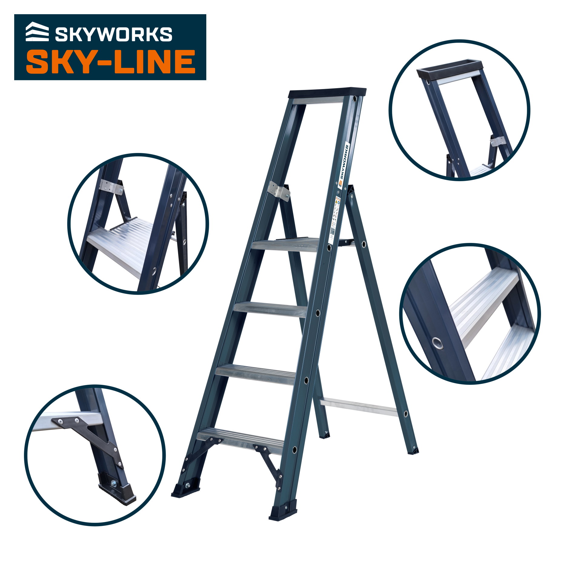De trap is gemaakt van hoge kwaliteit aluminium. Door de versterkte constructie van de extra diepe (100mm) treden, die zijn uitgevoerd in een volledig gesloten kokerprofiel met een interne verstevigingsbuis, is de trap zeer geschikt voor intensief professioneel gebruik.