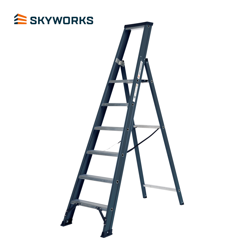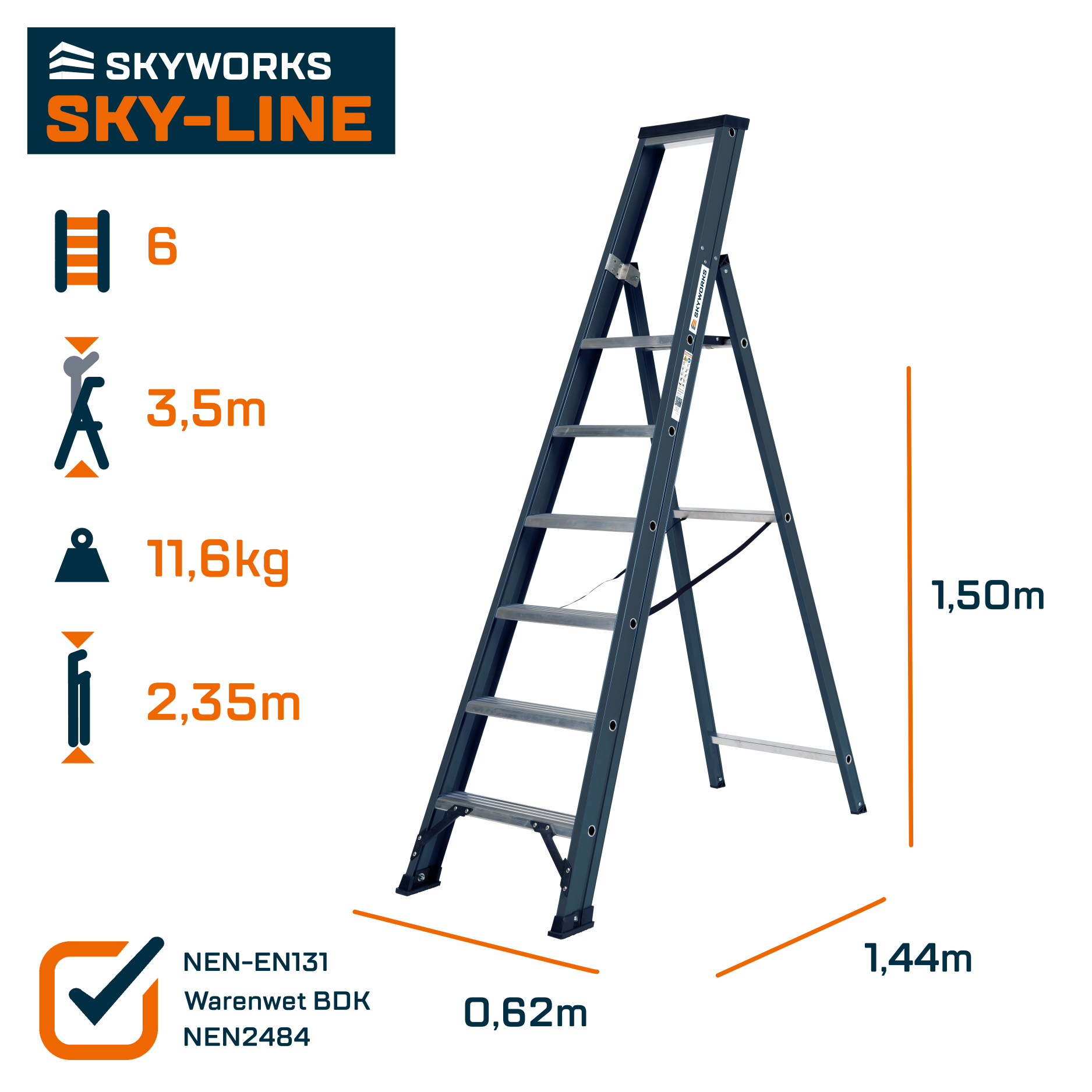 De Sky-Line bordestrap 6 treden is ideaal voor diverse onderhoudswerkzaamheden in en om een pand tot een werkhoogte van 3,5m. De trap is enkel oploopbaar en heeft 10cm diepe treden waardoor je comfortabel naar het stabordes klimt. De vaste kniebeugel, die standaard voorzien is van een materiaalbakje, geeft een goede steun wanneer je op het platform staat en biedt bij het klimmen extra houvast. Hierdoor kan je altijd veilig bij je werk komen.
