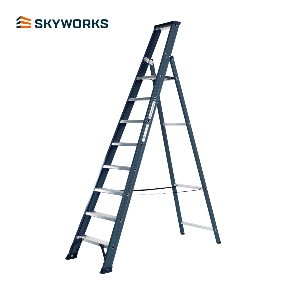 De Sky-Line bordestrap 8 treden is ideaal voor diverse onderhoudswerkzaamheden in en om een pand tot een werkhoogte van 4,0m. De trap is enkel oploopbaar en heeft 10cm diepe treden waardoor je comfortabel naar het stabordes klimt. De vaste kniebeugel, die standaard voorzien is van een materiaalbakje, geeft een goede steun wanneer je op het platform staat en biedt bij het klimmen extra houvast. Hierdoor kan je altijd veilig bij je werk komen.