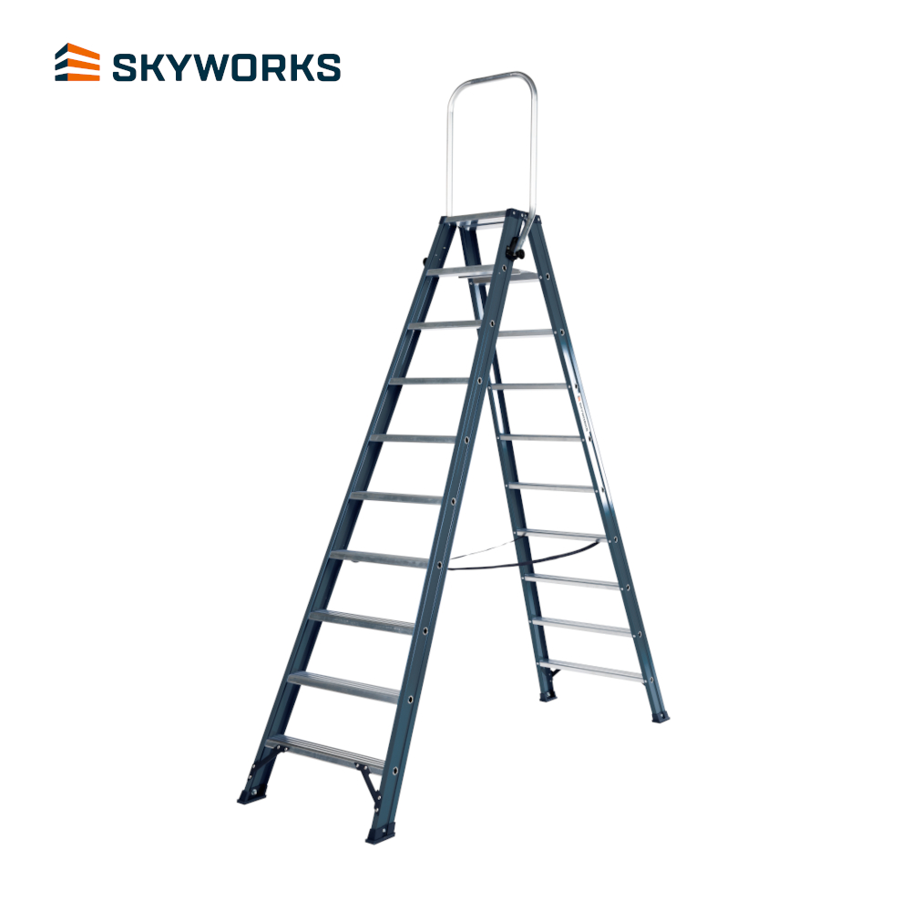 De Sky-Line dubbele trap 2x10 treden is ideaal voor diverse onderhoudswerkzaamheden in en om een pand tot een werkhoogte van 4,5m. De trap is dubbel oploopbaar waardoor je hem van 2 kanten kan beklimmen. De beugel, die neerklapbaar is, geeft een optimale steun wanneer je op het bovenste platform staat en geeft ook bij het klimmen een goede houvast. Hierdoor kan je altijd veilig bij je werk komen.