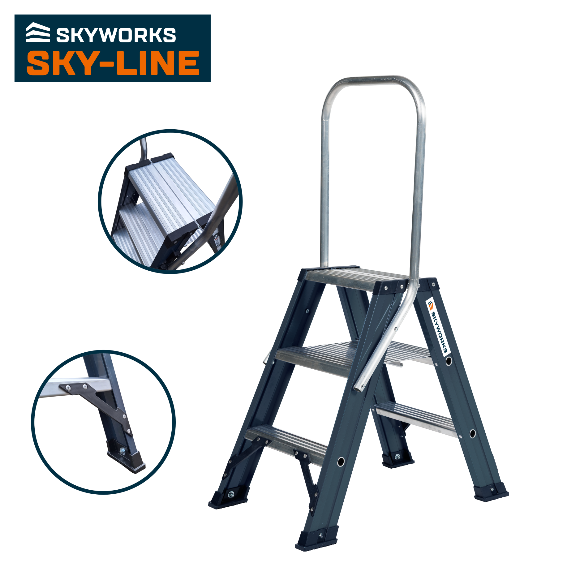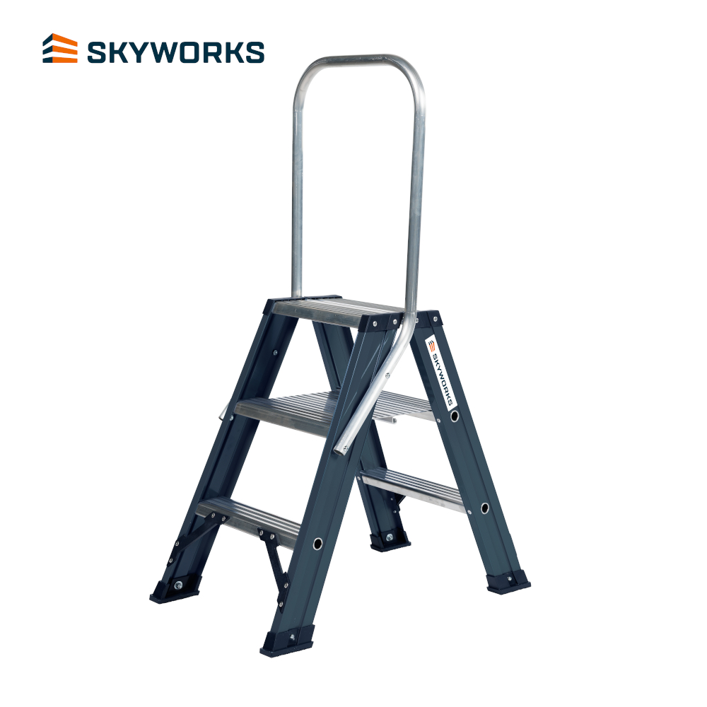 De Sky-Line dubbele trap 2x3 treden is ideaal voor diverse onderhoudswerkzaamheden in en om een pand tot een werkhoogte van 2,8m. De trap is dubbel oploopbaar waardoor je hem van 2 kanten kan beklimmen. De beugel geeft een optimale steun wanneer je op het bovenste platform staat en geeft ook bij het klimmen een goede houvast. Hierdoor kan je altijd veilig bij je werk komen.