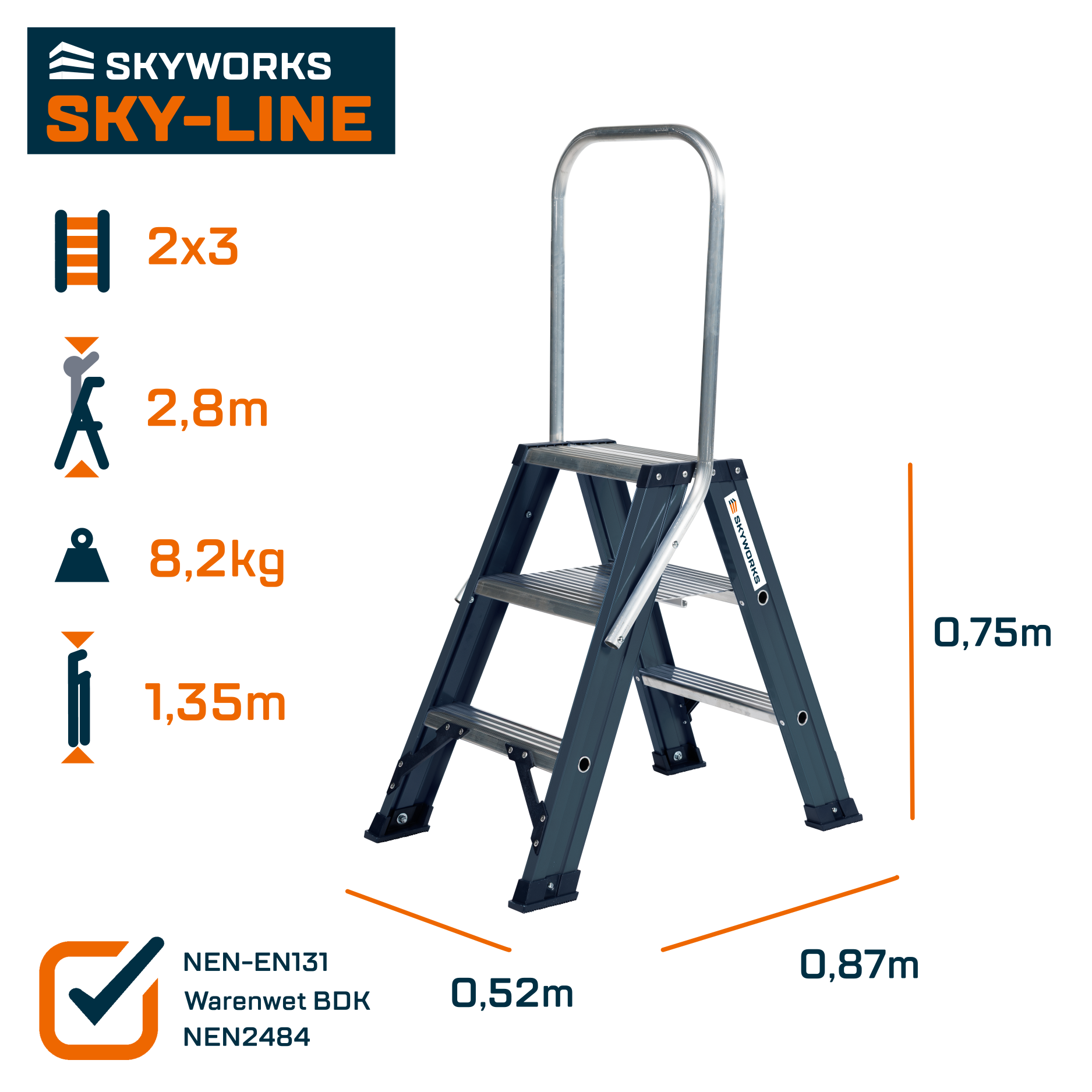 Voldoet aan Warenwet besluit Draagbaar Klimmaterieel, NEN2484 en NEN-EN 131.