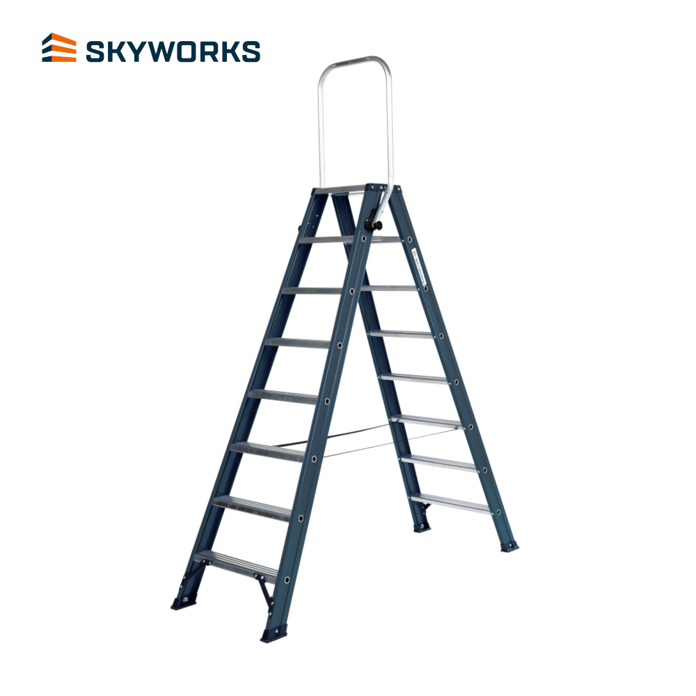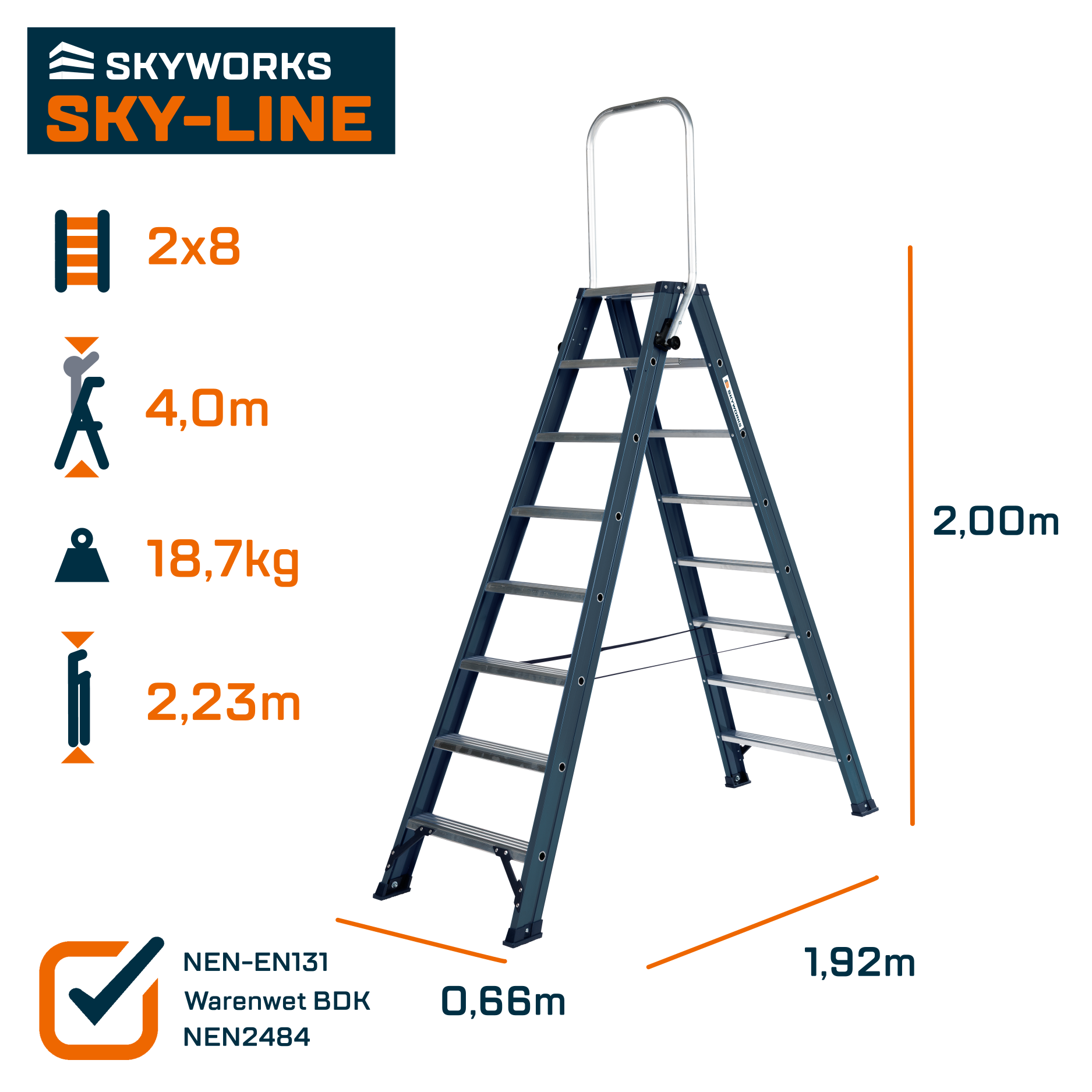De Sky-Line dubbele trap 2x8 treden is ideaal voor diverse onderhoudswerkzaamheden in en om een pand tot een werkhoogte van 4,0m. De trap is dubbel oploopbaar waardoor je hem van 2 kanten kan beklimmen. De beugel, die neerklapbaar is, geeft een optimale steun wanneer je op het bovenste platform staat en geeft ook bij het klimmen een goede houvast. Hierdoor kan je altijd veilig bij je werk komen.