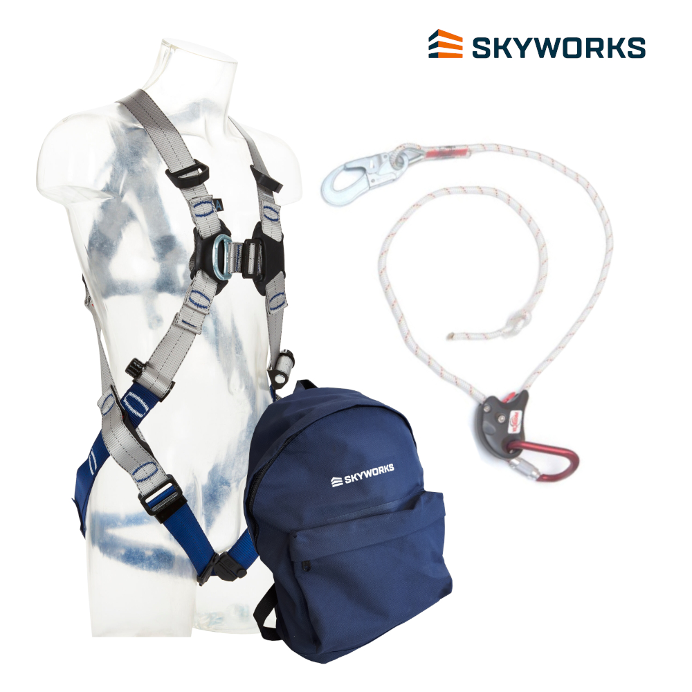 De set wordt geleverd met een rugzak waar je je veiligheidsharnas en lijn goed beschermd kan opbergen en makkelijk meeneemt naar de volgende klus.