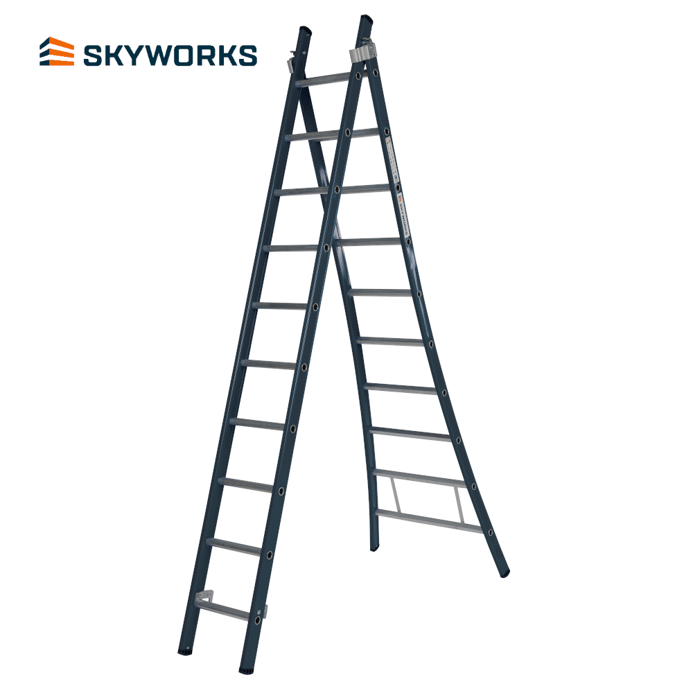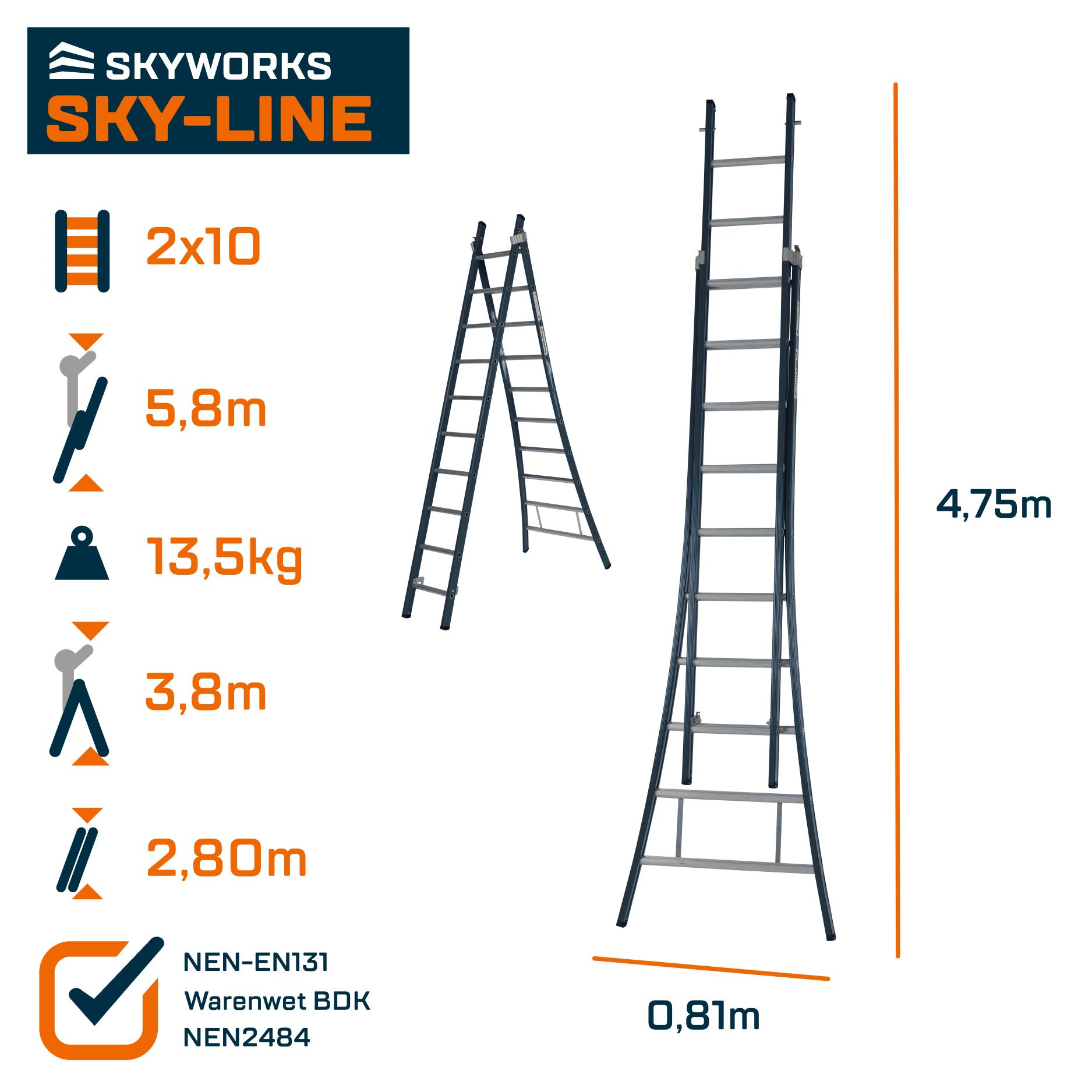 Deze Sky-Line reformladder 2x10 is ideaal voor het uitvoeren van kortdurende onderhoudsklussen tot een werkhoogte van 5,8m en toegang tot een verdieping tot ca. 3,5m hoogte. Bij vrijstaand gebruik is de werkhoogte ca. 3,8m