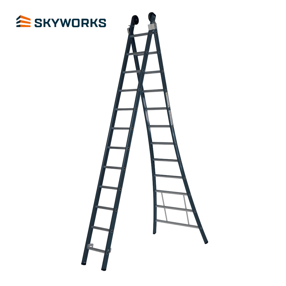 Deze Sky-Line reformladder 2x12 is ideaal voor het uitvoeren van kortdurende onderhoudsklussen tot een werkhoogte van 6,8m en toegang tot een verdieping tot ca. 4,3m hoogte. Bij vrijstaand gebruik is de werkhoogte ca. 4,3m