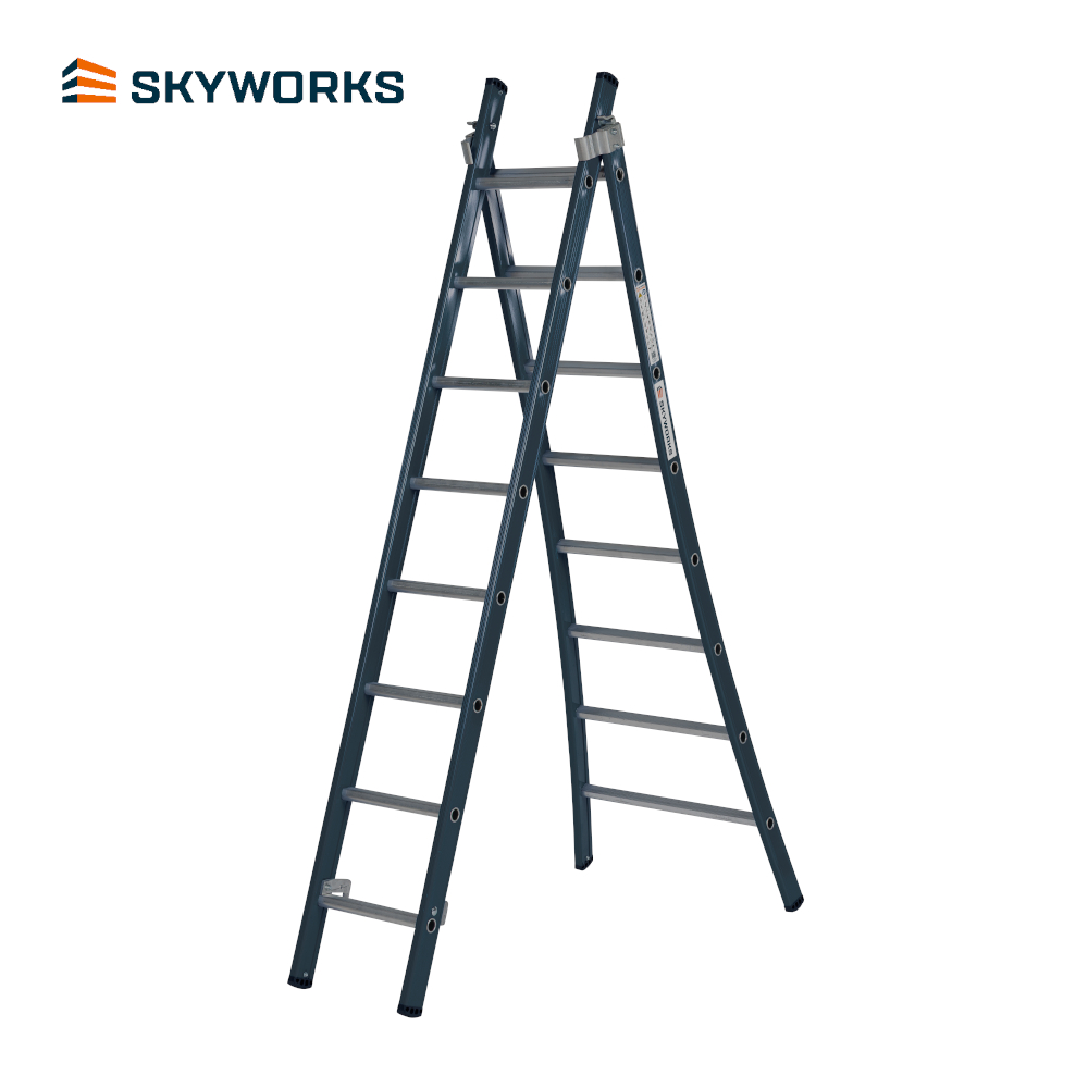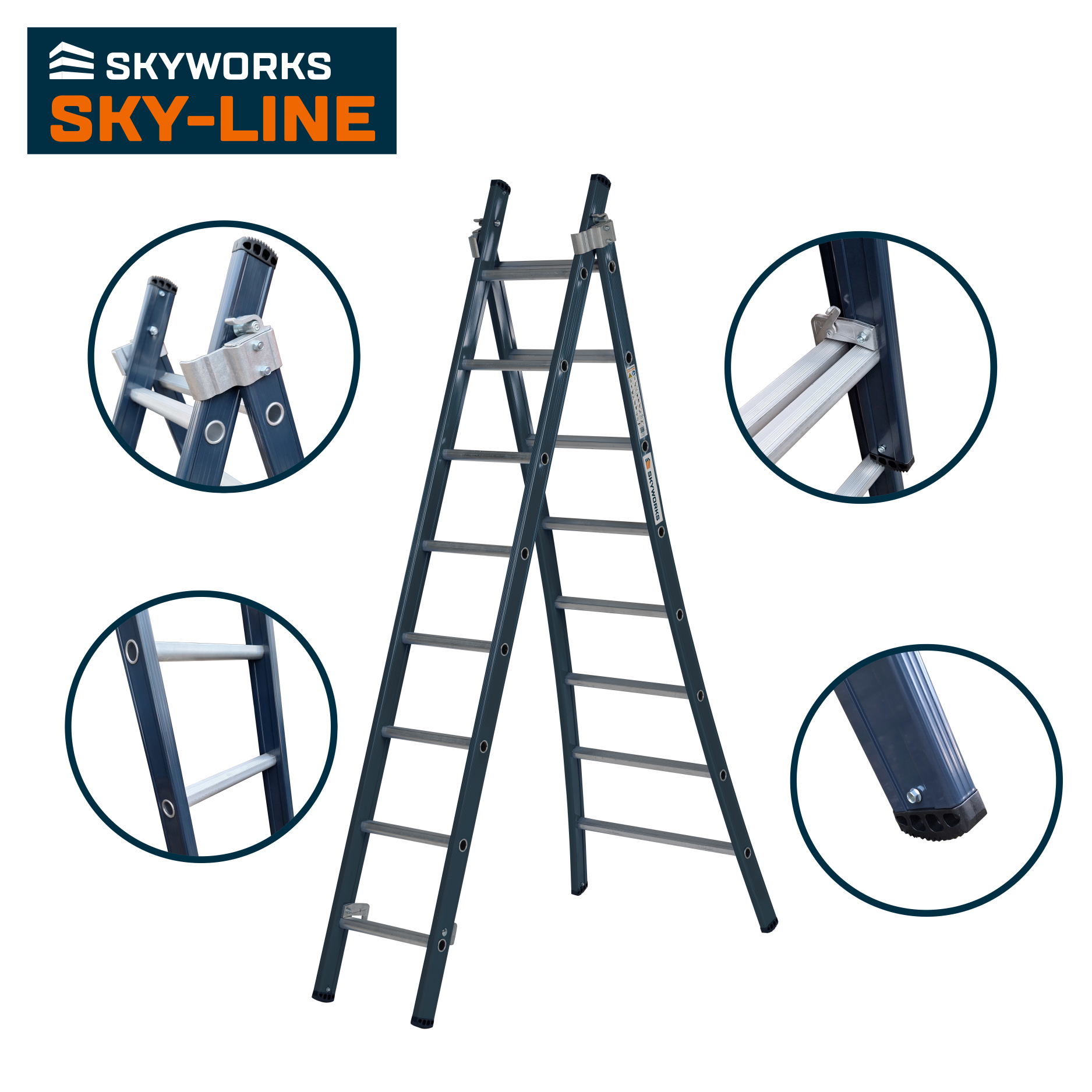 Deze Sky-Line reformladder 2x8 is ideaal voor het uitvoeren van kortdurende onderhoudsklussen tot een werkhoogte van 4,8m en toegang tot een verdieping tot ca. 2,5m hoogte. Bij vrijstaand gebruik is de werkhoogte ca. 3,3m
