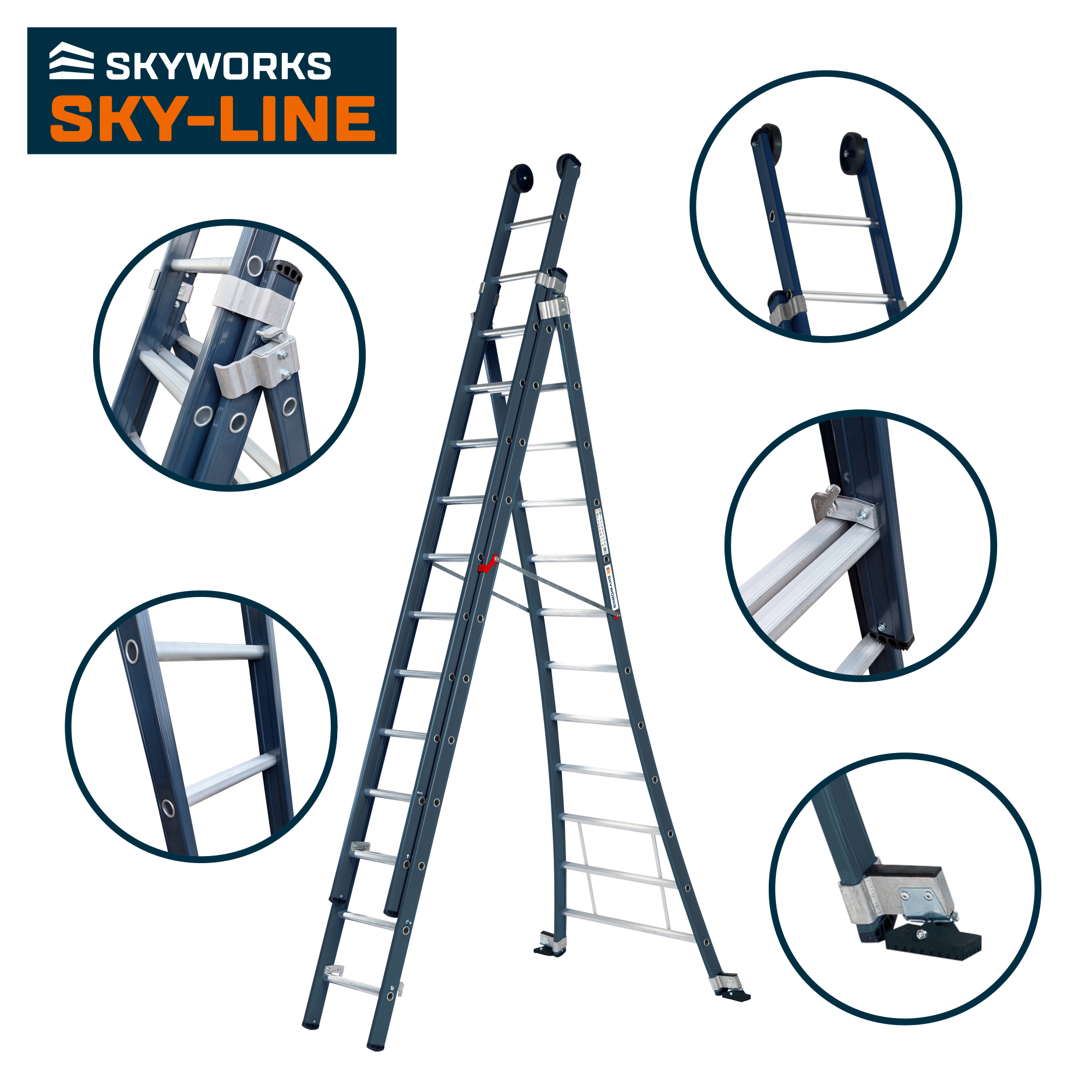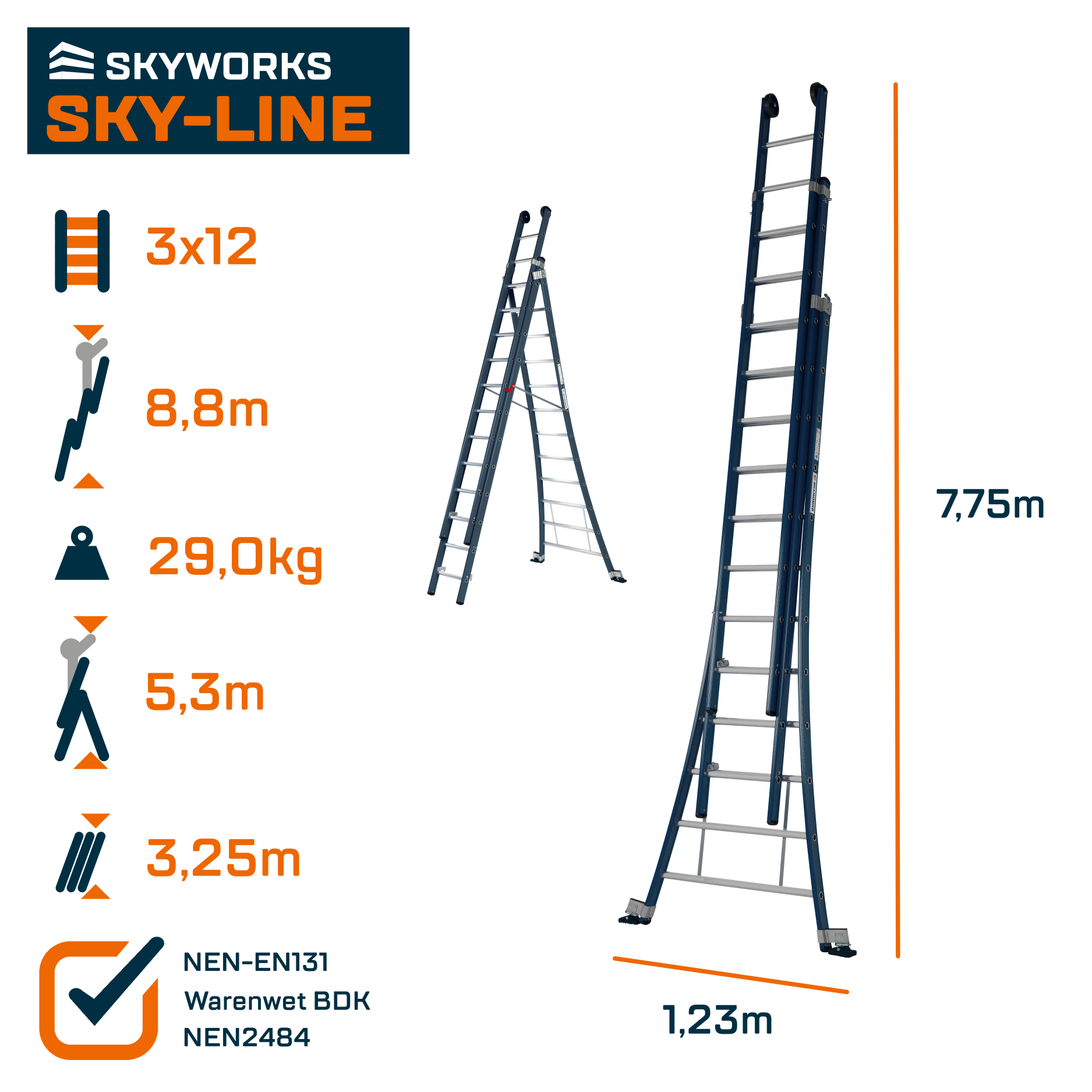 Deze 3-delige reformladder 3x12 is ideaal voor het uitvoeren van kortdurende onderhoudsklussen tot een werkhoogte van 8,8m en toegang tot een verdieping tot ca. 6,0m hoogte. Bij vrijstaand gebruik is de werkhoogte ca. 5,3m.