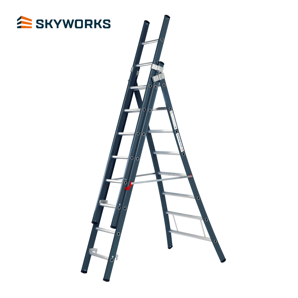 De lichtgewicht aluminium ladder heeft een basis met uitgebogen bomen waardoor je hem ook goed stabiel kan neerzetten als de ondergrond niet helemaal vlak is. Deze reform uitvoering heeft een dubbele functie en kan zowel als opsteekladder als vrijstaande ladder gebruikt worden. Ingeschoven is deze 3-delige ladder makkelijk te transporteren en compact op te bergen.