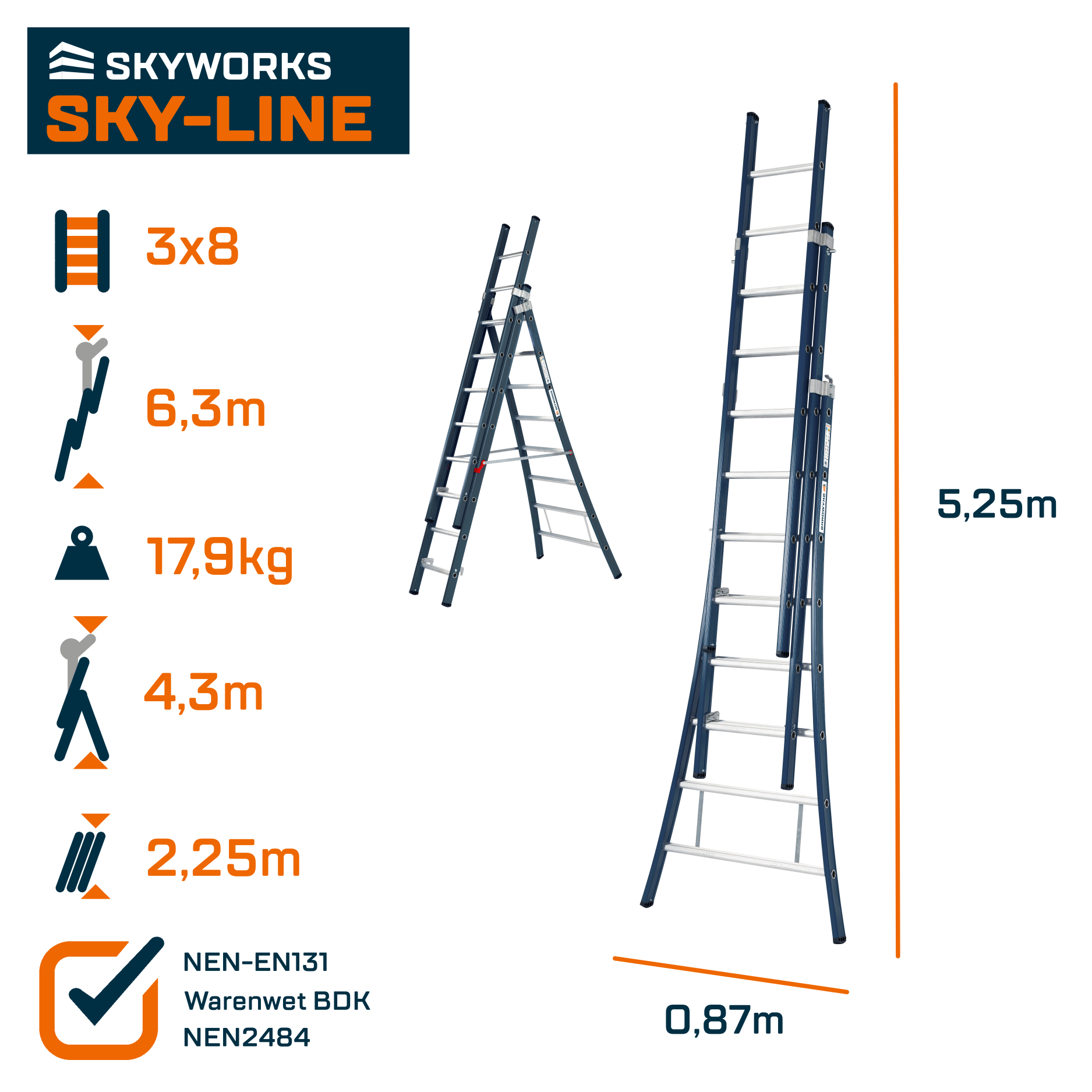 Deze 3-delige reformladder 3x8 is ideaal voor het uitvoeren van kortdurende onderhoudsklussen tot een werkhoogte van 6,3m en toegang tot een verdieping tot ca. 4,0m hoogte. Bij vrijstaand gebruik is de werkhoogte ca. 4,3m.